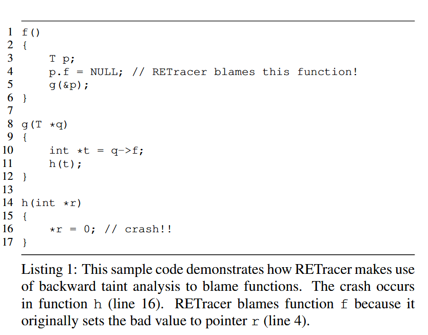 一个简单的例子如清单 1 所示。在本例中,崩溃发生在函数 h 第 16 行。通过逆向污点分析,RETracer 可以发现,坏指针 r 最初是在第 4 行的函数 f 中设置的。因此,RETracer 将这次崩溃归咎于函数 f。