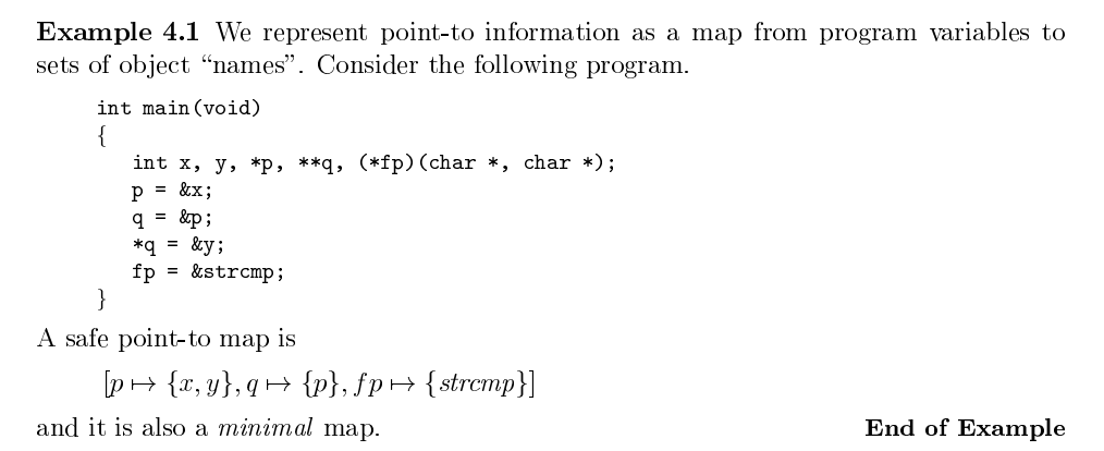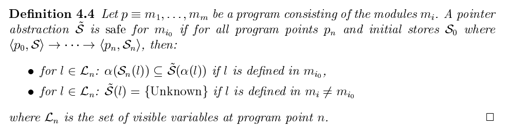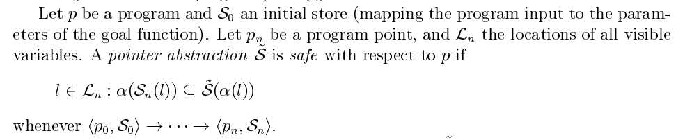 假设p是一个程序,是一个初始存储(从程序输入映射到目标函数参数)。让是一个程序点,让是所有可见变量的位置。一个指针抽象S相对于程序点p是安全的,当且仅当