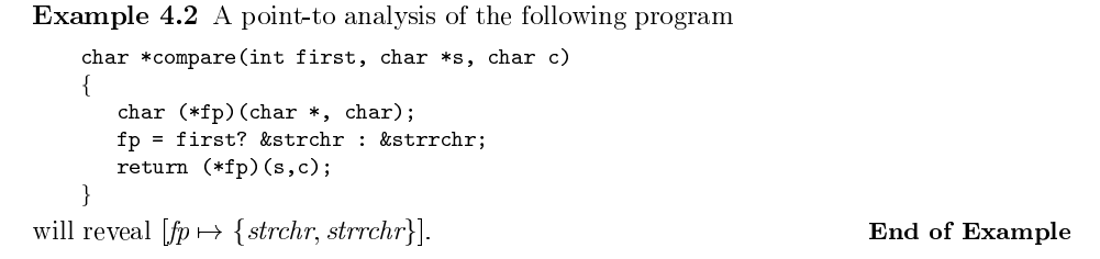 对于每个指针类型的对象,我们在程序执行时决定一个安全的近似计算对指针也许指向的地址集合,对于所有可能的输入。一个特别的例子是函数指针。分析的结果是指针也许会调用的函数集合。