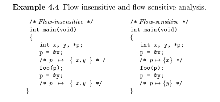 流敏感和不敏感分析是一个在精确度和效率之间的妥协:一个流敏感分析是更精确的,但是用了更多空间并且更慢。